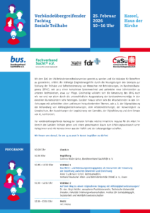 Verbändeübergreifender Fachtag Soziale Teilhabe 25.02.2026 Haus der Kirche, Kassel PROGRAMM ANMELDUNG Bitte aktivieren Sie JavaScript in Ihrem Browser, um dieses Formular fertigzustellen.Bitte aktivieren Sie JavaScript in Ihrem Browser, um dieses Formular fertigzustellen.AnredeFrauHerrVorname *Nachname *Akad. GradEmail *Telefon *Institution/Klinik/Einrichtung *Institution/Klinik/Einrichtung ZusatzPLZ *Ort *Straße/Postfach *Email Rechnung (falls abweichend von o.a. Mailadresse) Abweichende Rechnungsadresse *neinjaInstitution/Klinik/Einrichtung *PLZStraße/PostfachInstitution/Klinik/Einrichtung ZusatzOrtEmail Rechnung (falls abweichend von o.a. Mailadresse)Ich möchte an folgendem Workshop teilnehmen: *Workshop 1: Auswirkungen der Legalisierung von Cannabis für die Einrichtungen der Sozialen TeilhabeWorkshop 2: Gewaltschutz in der Teilhabe und RehabilitationWorkshop 3: Digitalisierung und KI in der sozialen Teilhabe – Stand der EntwicklungenWorkshop 4: Qualitätsprüfungen in der Sozialen TeilhabeWorkshop 5: Teams neu gedacht: Mitarbeiter:innen mit Lebens-, Psychiatrie- und /oder Berufserfahrung? Erste Erfahrungen mit Quereinsteiger:innen und Genesungsbegleiter: innen in der GemeindepsychiatrieWorkshop 6: Schnittstelle Soziale Teilhabe und Pflegekein WorkshopDatenschutz Ihre Anmeldung wird in einer Datenbank elektronisch gespeichert und im Rahmen der Veranstaltungsorganisation verarbeitet. Die Einwilligung in die Speicherung und zweckgerichtete Verarbeitung Ihrer Daten können Sie jederzeit unter bundesverband@suchthilfe.de widerrufen. Unsere Datenschutzerklärung finden Sie unter www.suchthilfe.de. Ich habe die Datenschutzerklärung zur Kenntnis genommen und stimme der Verarbeitung meiner Daten zu. *jaFür den Fachtag erstellen wir Teilnehmer*innenlisten. *Ja, ich stimme zu, dass mein Name und die Einrichtung auf der Liste aufgeführt werden.Nein, ich stimme nicht zu, dass mein Name und die Einrichtung auf der Liste aufgeführt werden.Anmeldung absenden ← zu allen Veranstaltungen